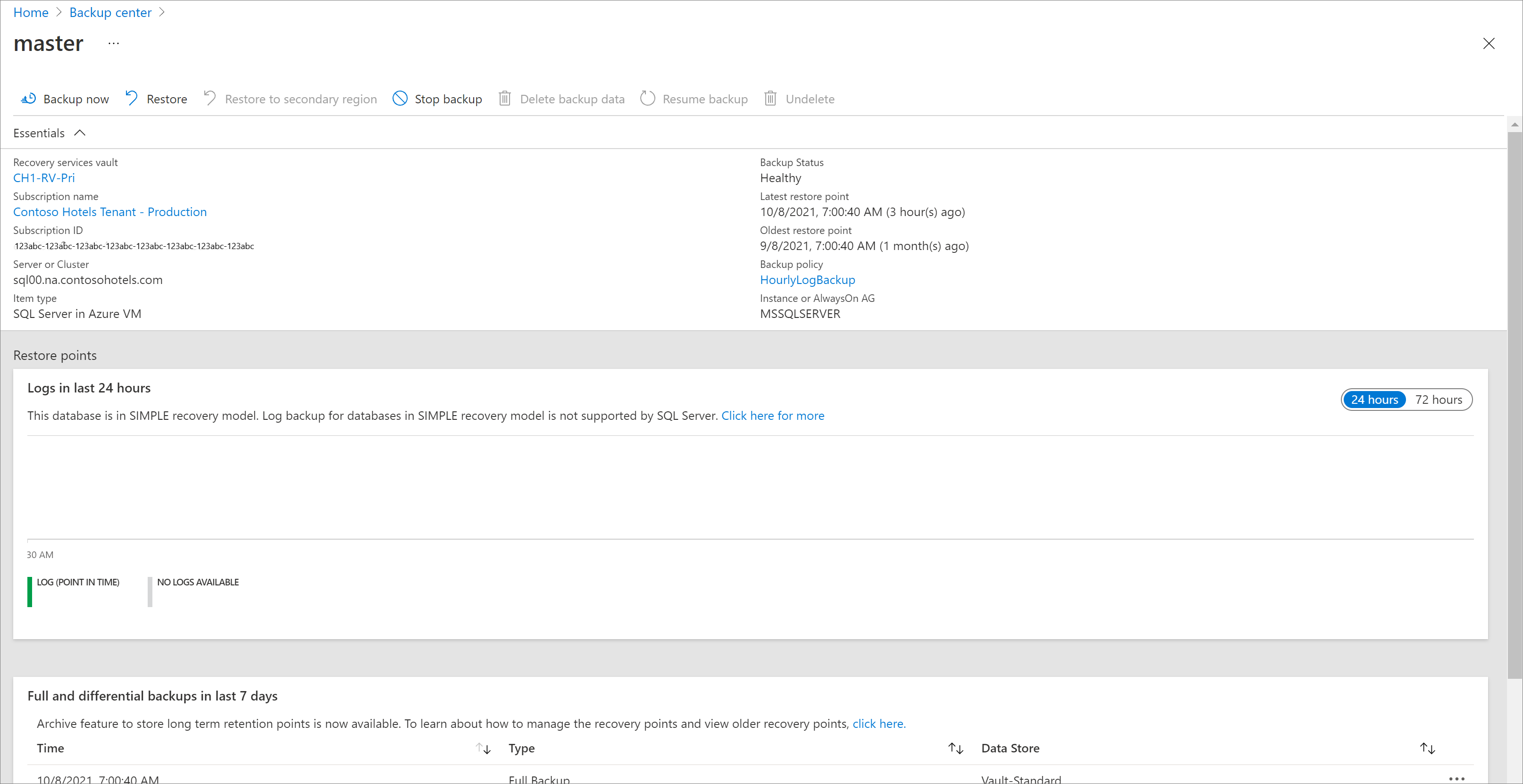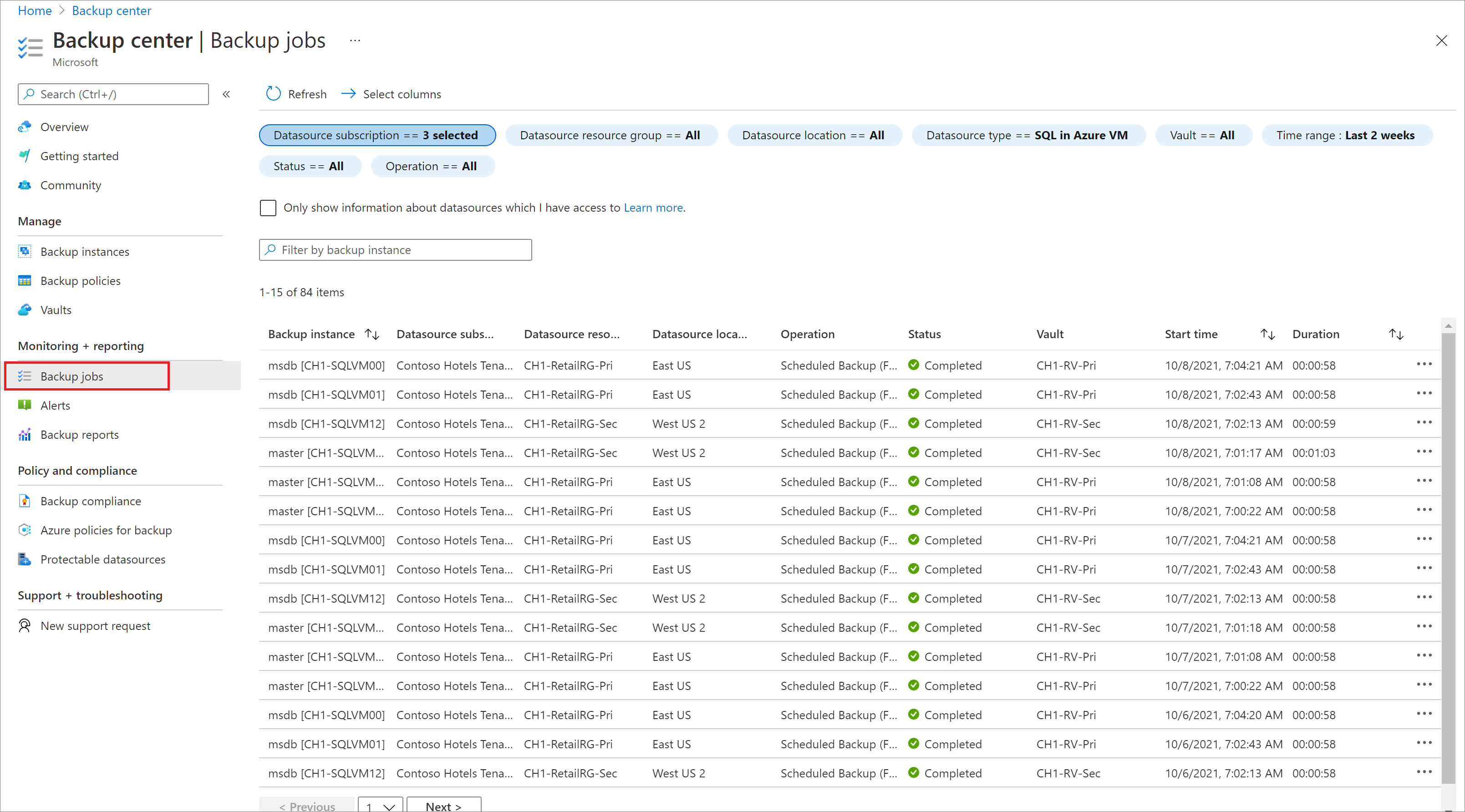 Azure Backup 在 Azure portal 的 Backup center 中的 Backup 作业 下显示所有计划和按需操作,但由于计划日志备份的频率可能非常高,因此不包括它们。 此门户中显示的作业包括数据库发现和注册、配置备份以及备份和还原操作。