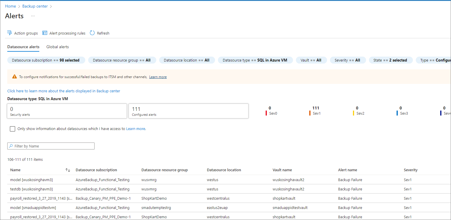 在Azure portal中,转到 Backup center,并筛选 Azure VM 中的 SQL数据源类型。