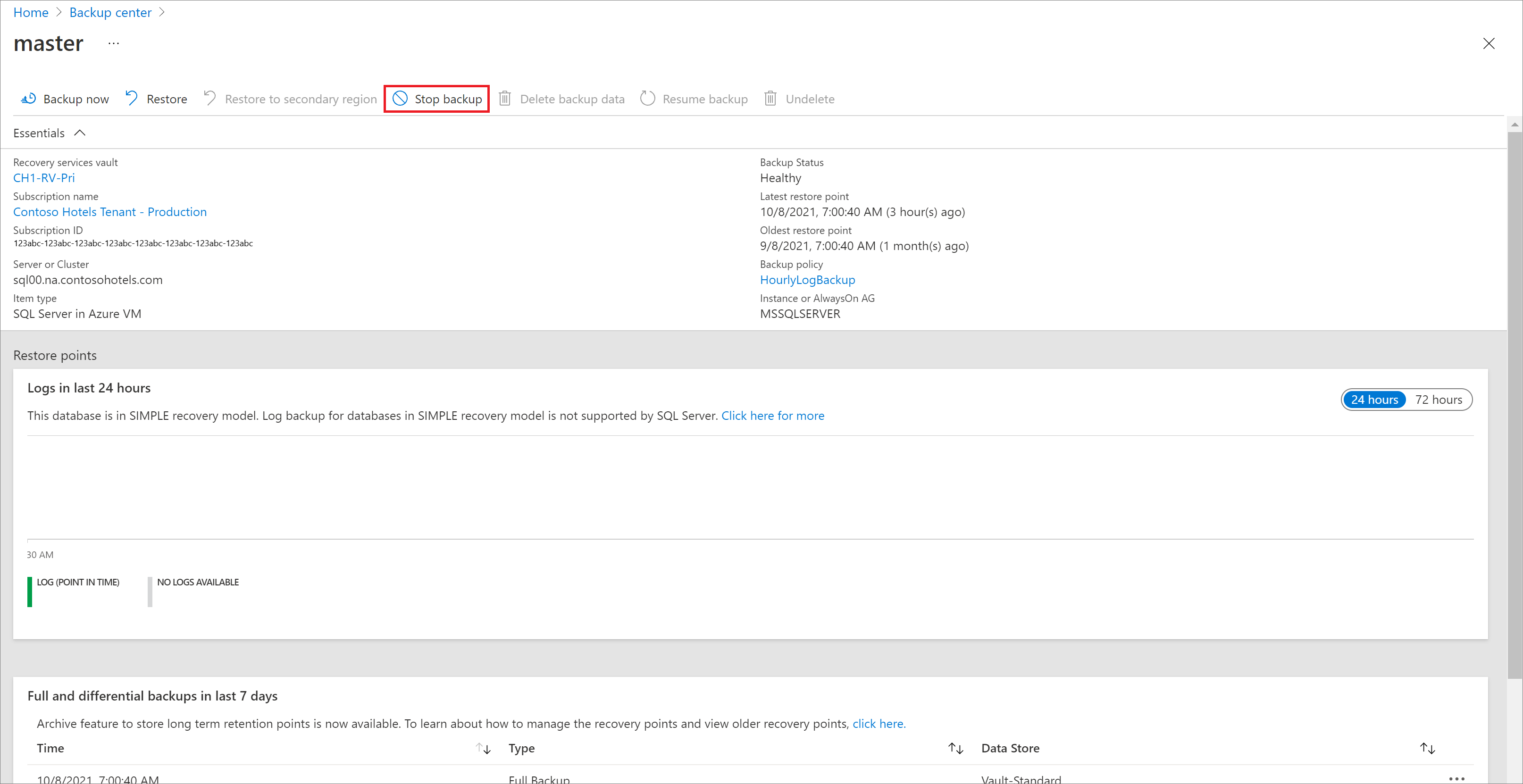 - 所有恢复点都将永久保持不变,所有删除操作都将在停止保护时停止,并保留数据。