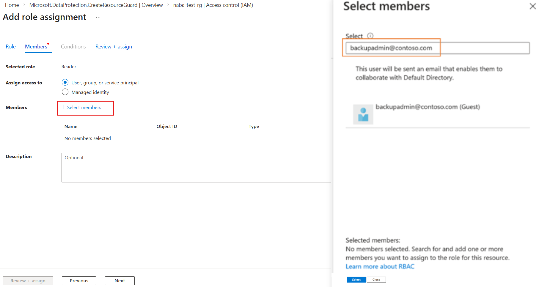 单击“选择成员”并添加备份管理员的电子邮件 ID,将其添加为读取者。 由于在这种情况下,备份管理员在另一个租户中,它们将作为来宾添加到包含资源防护的租户。