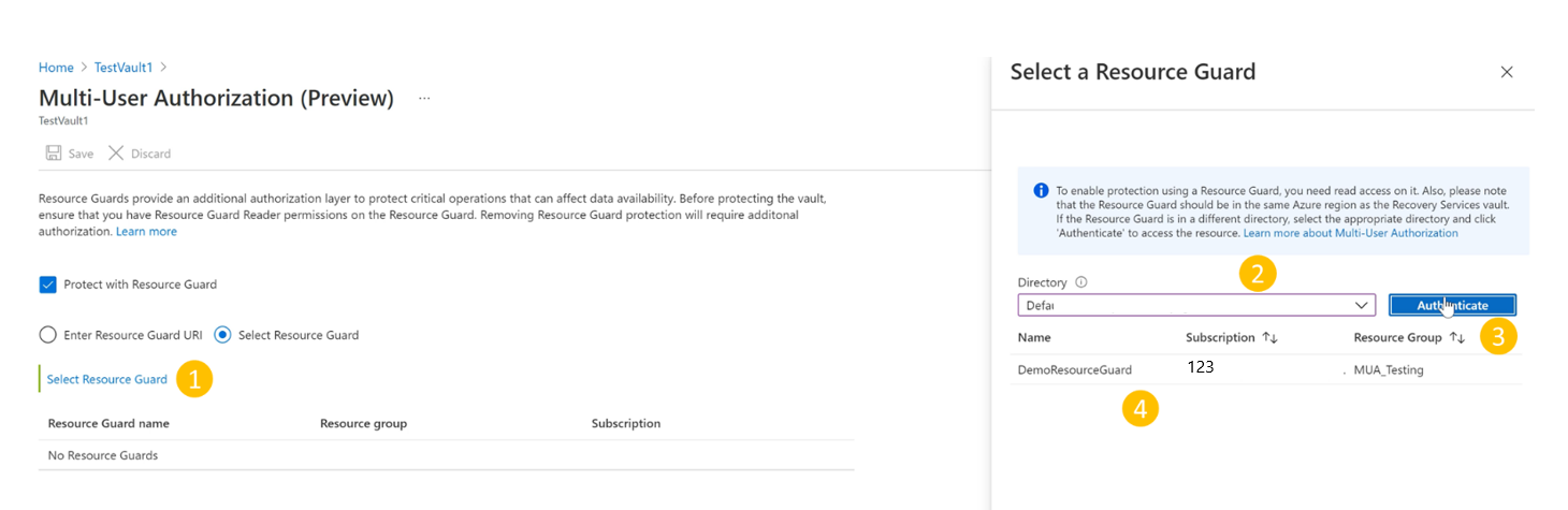 - Resource Guard 和备份保管库必须位于同一 Azure 区域中。