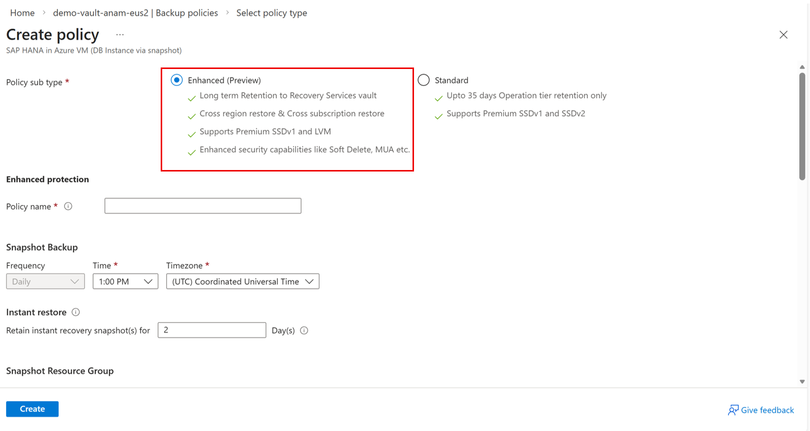在“ 创建策略 ”窗格中,选择 “策略”子类型。 选择 增强型(预览版) 策略以在恢复服务保管库中长期保留快照备份,并利用其他安全功能,例如不可变性、软删除、MUA 等。