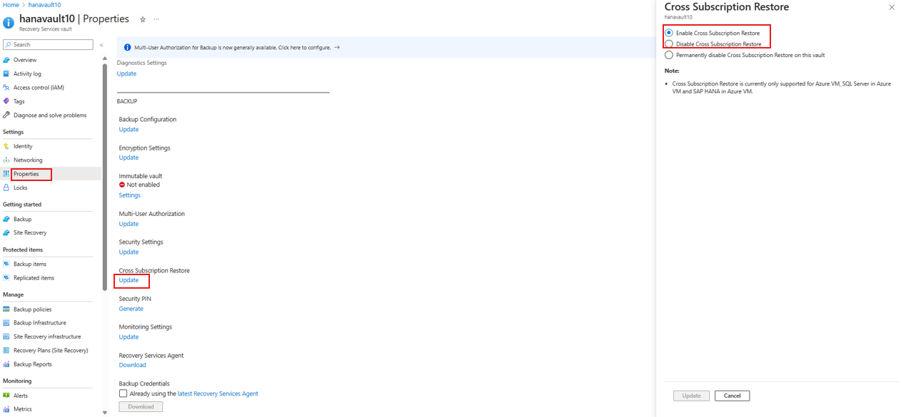 默认情况下,在恢复服务保管库上启用 CSR。 若要更新恢复服务保管库还原设置,请转到“属性”>“跨订阅还原”,然后进行所需的更改。
