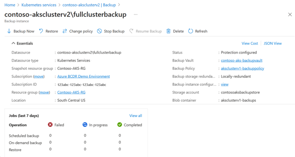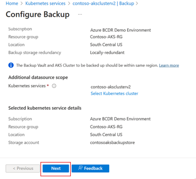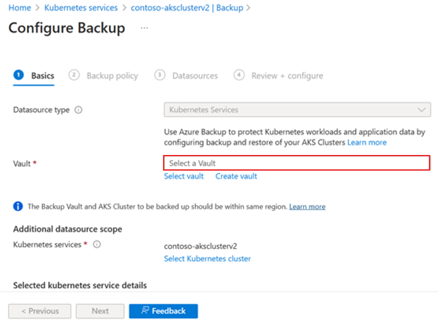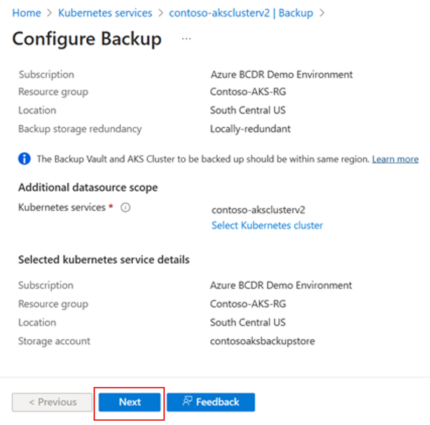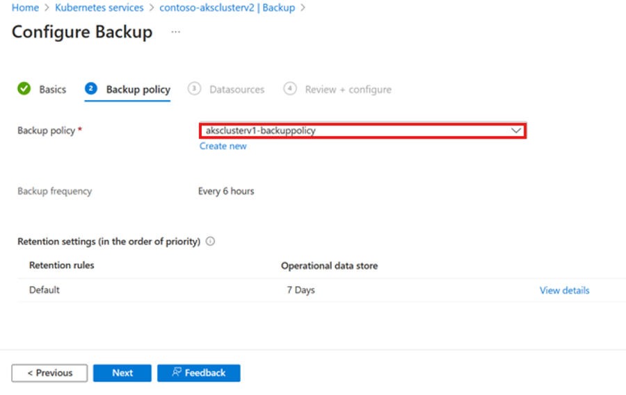 TrustedAccessPreview资源提供程序启用Microsoft.ContainerServices功能标志。选择备份策略,它定义了备份计划及其保留期。 然后选择下一步。
