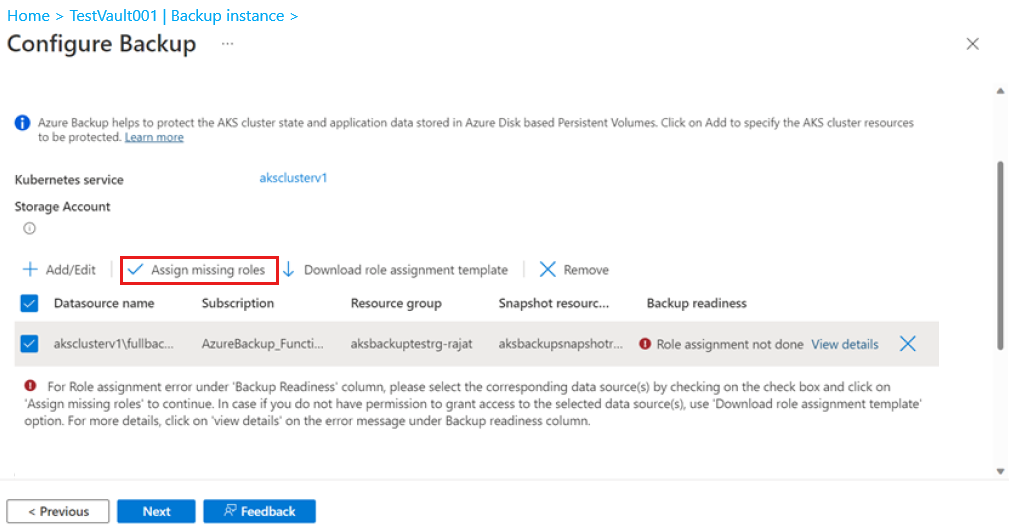 验证完成后,如果未将所需角色分配到快照资源组中的保管库,则会出现错误。