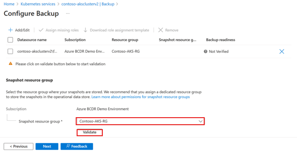 对于“快照资源组”,请选择用于存储永久性卷(Azure 磁盘存储)快照的资源组。 然后,选择“验证”。