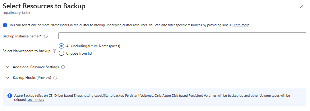 展开“其他资源设置”以查看可用于选择要备份的群集资源的筛选器。 可以选择根据以下类别备份资源: