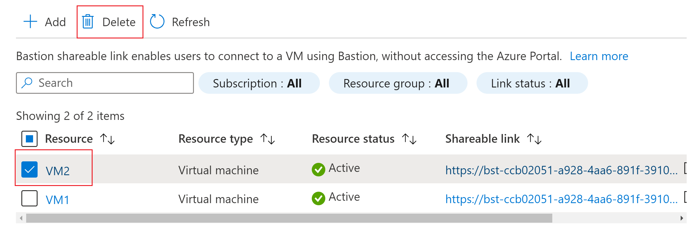 - Microsoft.Network/bastionHosts/deleteShareableLinks/action