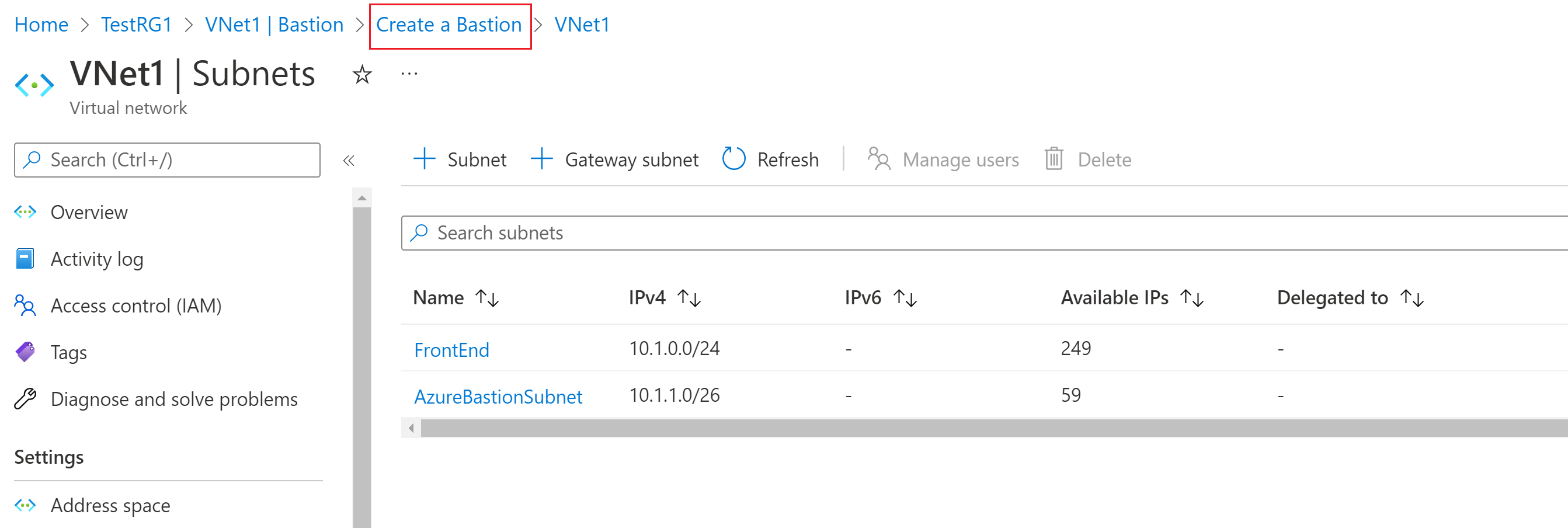 若要配置 AzureBastionSubnet,请选择“管理子网配置”。