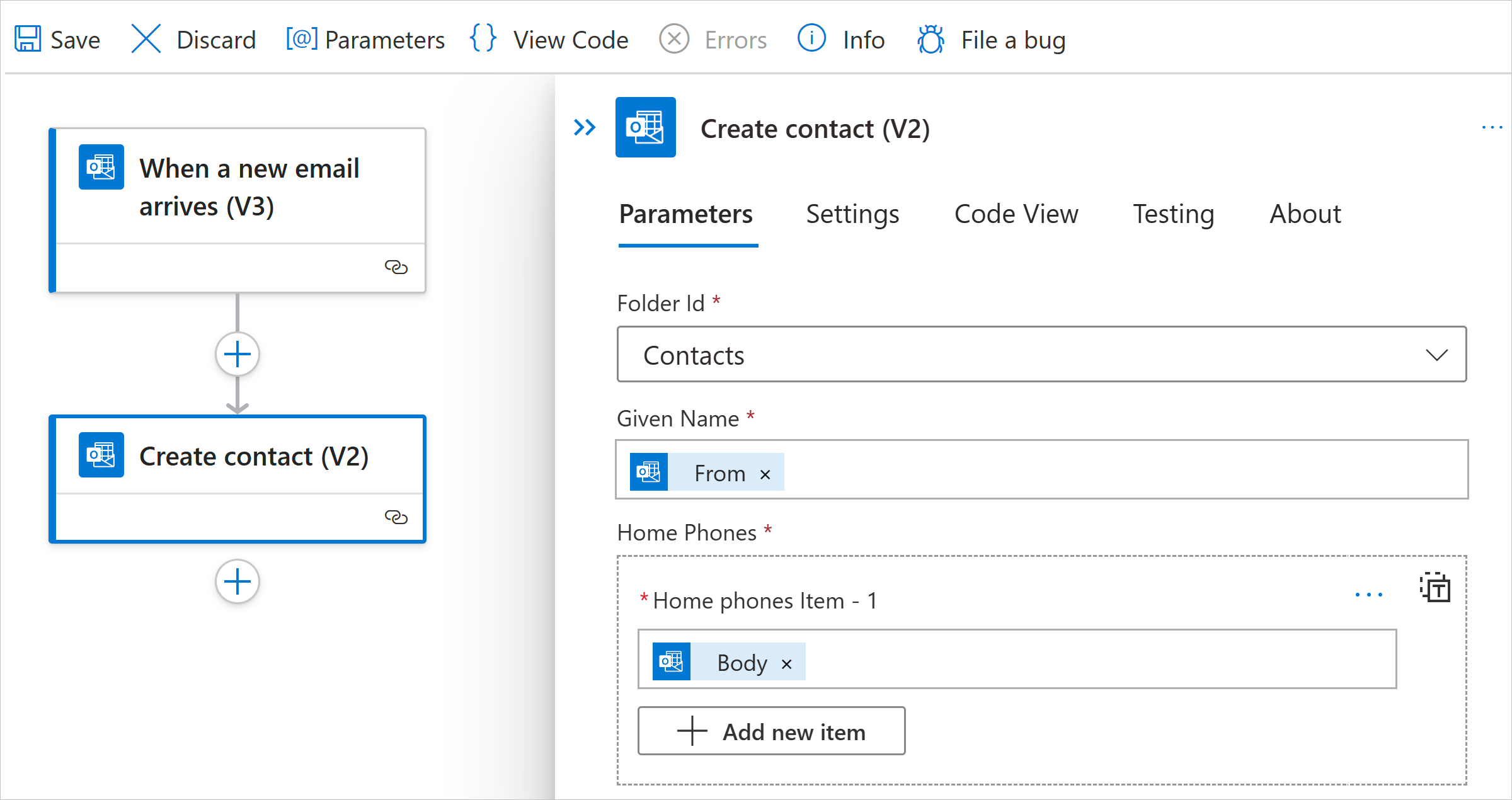 参数 必须 值 说明 Folder Id 是 联系人 该操作用于创建新联系人的文件夹 名字 是 <contact-name 为联系人使用的名称 住宅电话 是 <home-phone-number 联系人的住宅电话号码 此示例选择相关操作用于创建新联系人的“联系人” 文件夹,并将触发器的输出用于其余参数值: