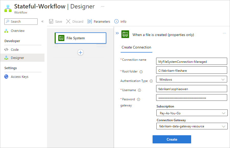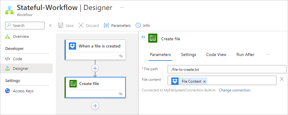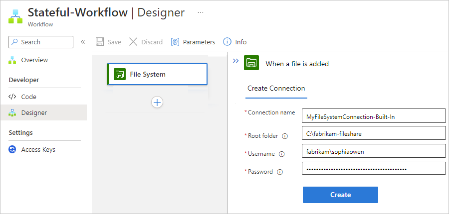 有关详细信息,请参阅文件系统触发器。 此示例继续执行名为“创建文件”的操作。