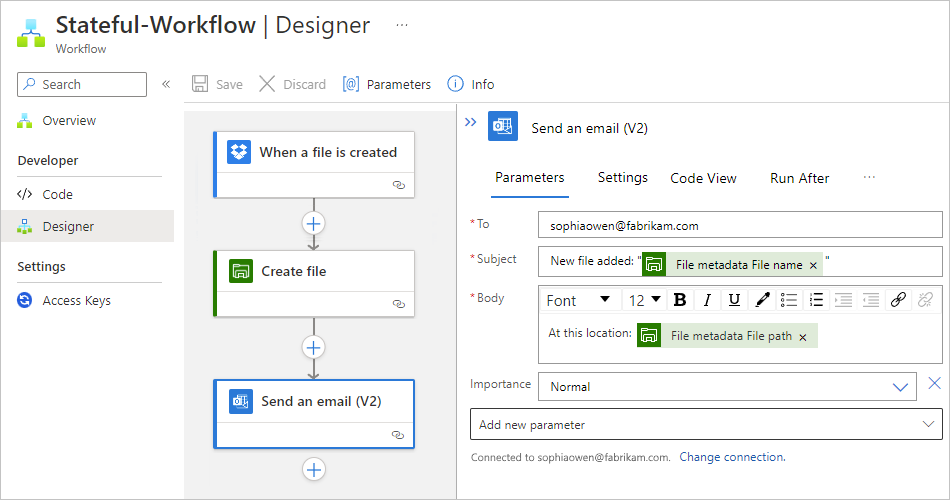 • 在创建文件或将文件添加到文件共享时触发工作流,然后发送一封电子邮件。
