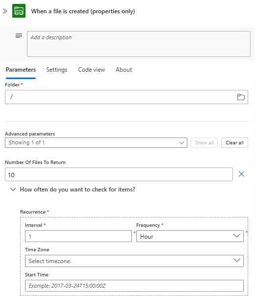 对于此示例,请选择文件系统服务器上的文件夹路径以检查新创建的文件。 指定要返回的文件数以及自己需要的检查频率。