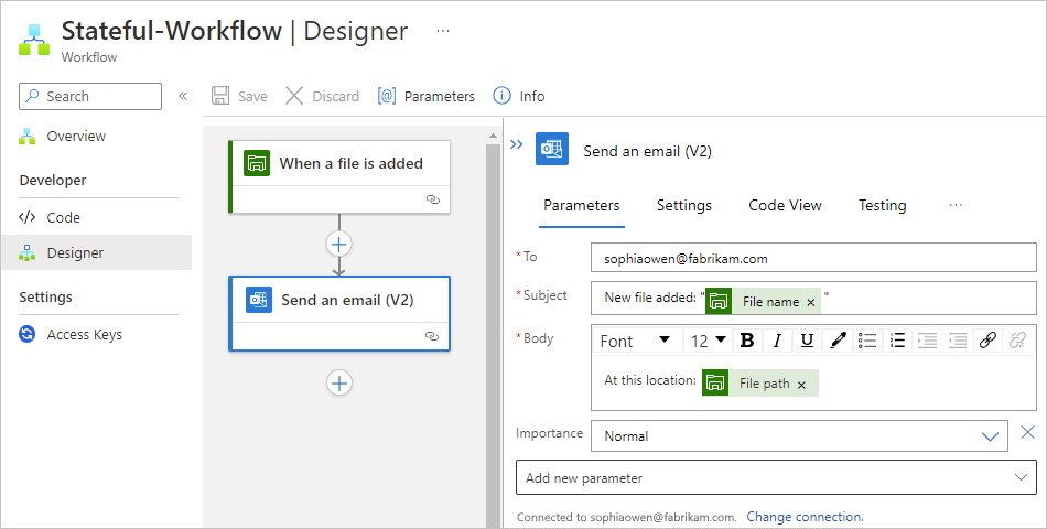 2. 若要测试工作流,请添加一个 Outlook 连接器操作,该操作会在指定文件夹的文件系统中新建文件时向您发送电子邮件。 输入电子邮件收件人、主题和正文。 若要测试,可以使用自己的电子邮件地址。