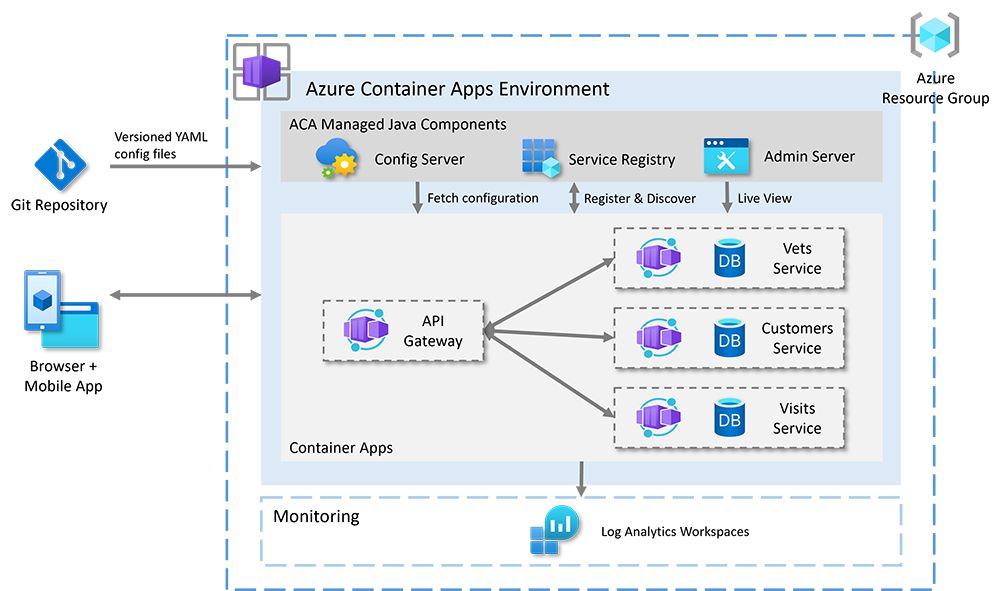 - 这些应用使用 Azure 容器应用上的托管 Java 组件,包括服务注册表、配置服务器和管理服务器。