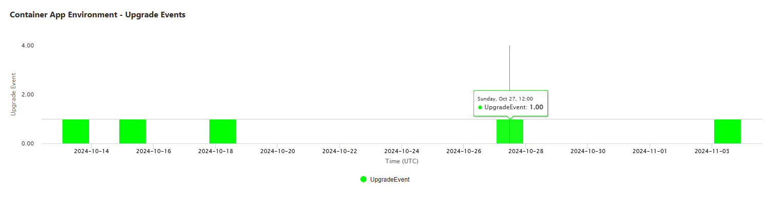 在“诊断并解决问题”窗口中,可以查看上个月已配置的维护时段和发生的升级事件。 将鼠标悬停在图表中的条形图上时,可以看到每个升级事件的开始时间。