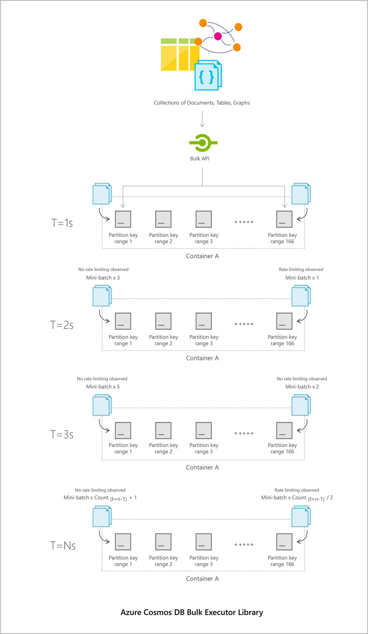 批量执行程序库可确保最大程度地利用分配给集合的吞吐量。 它使用适用于每个 Azure Cosmos DB 分区键范围的 AIMD 样式拥塞控制机制,可以有效地处理速率限制和超时。