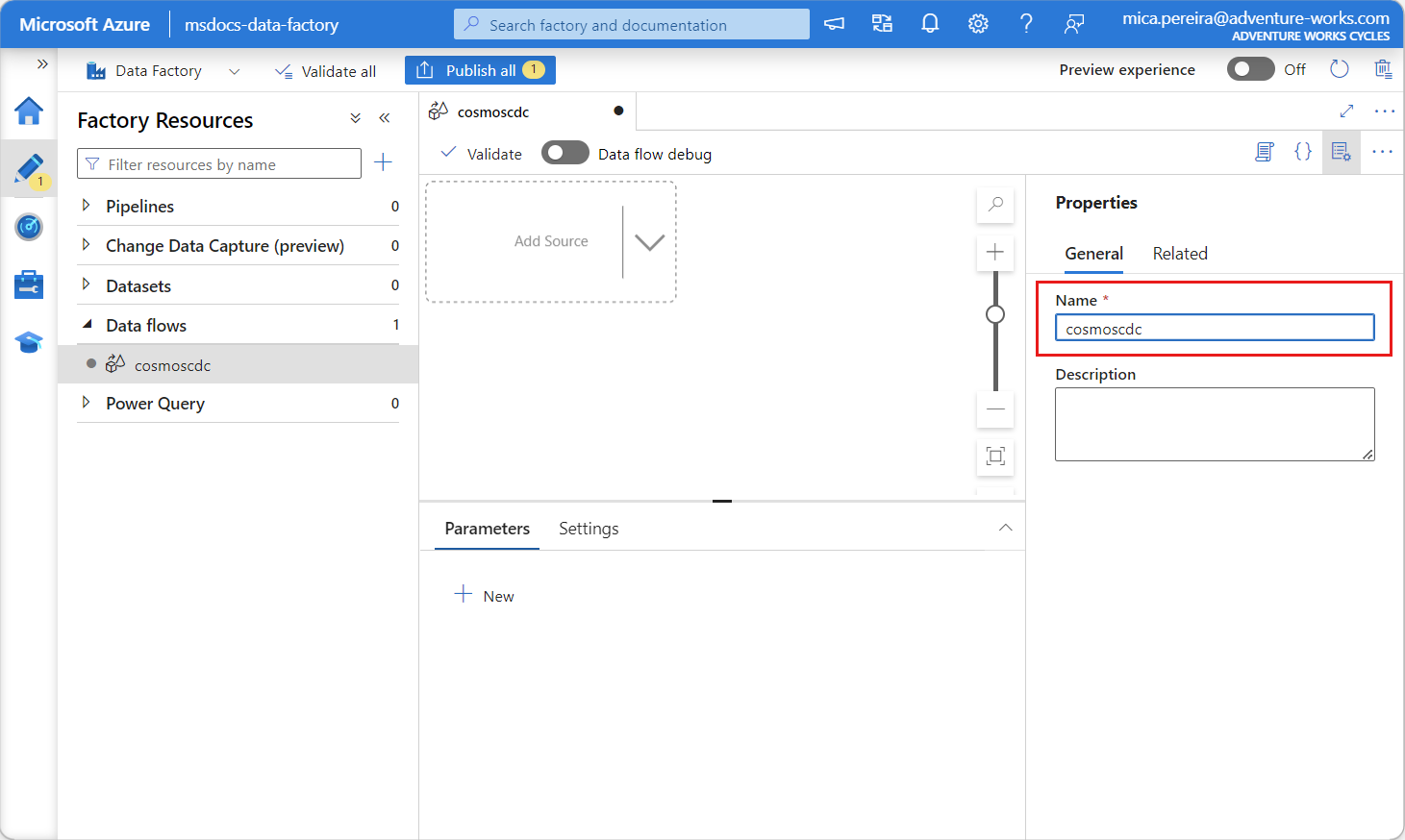 分析存储的变更数据捕获功能可通过 Azure 数据工厂或 Azure Synapse Analytics 的数据流功能获得。 对于本指南,请使用 Azure 数据工厂。