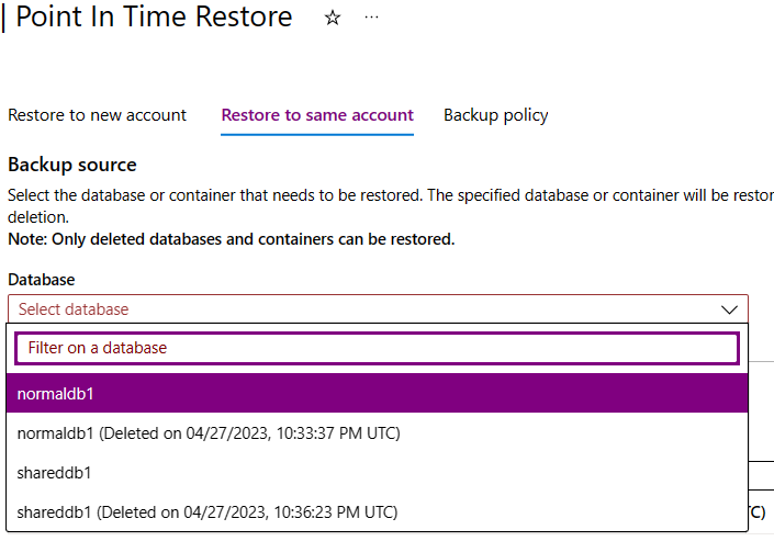 Microsoft.DocumentDB/locations/restorableDatabaseAccounts/*/read权限的情况下,才会填充 Azure 门户中的“还原”页。 若要详细了解此权限,请参阅备份和还原权限。选择“还原到同一帐户”选项卡。