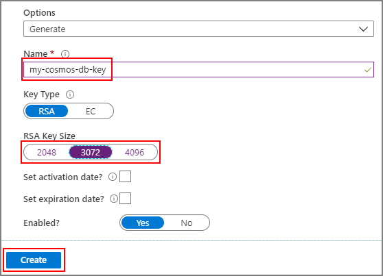 选择“生成/导入”,为新密钥提供名称,并选择一个 RSA 密钥大小。 建议至少使用 3072,以获得最佳安全性。 然后选择“创建”: