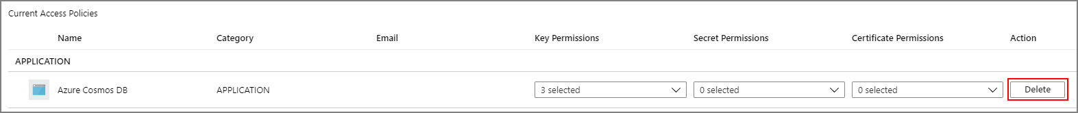 或者,若要从 Azure Key Vault 实例撤销所有密钥,可以删除授予 Azure Cosmos DB 主体的访问策略: