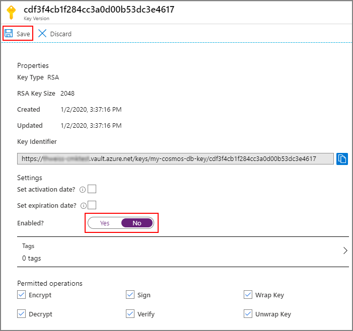 当Azure Key Vault 审核日志不再显示来自 Azure Cosmos DB 的该密钥或密钥版本的活动时,可以禁用以前的密钥或密钥版本。 在密钥轮换 24 小时后,不应在以前的密钥或密钥版本上进行更多活动。