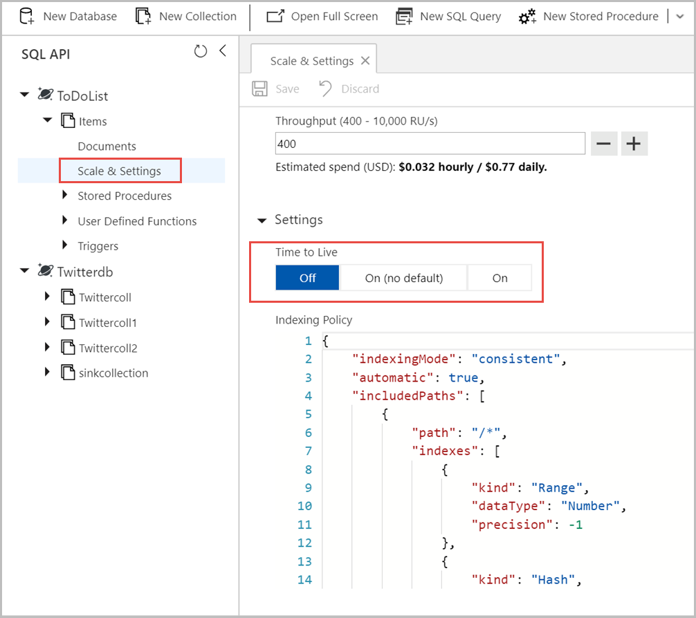 可以通过对项执行写入或更新操作来重置项上的 TTL。 写入或更新操作会将_ts设置为当前时间,并且项目到期的TTL计时将重新开始。 若要更改项的 TTL,可以更新相关字段,就像更新任何其他字段那样。