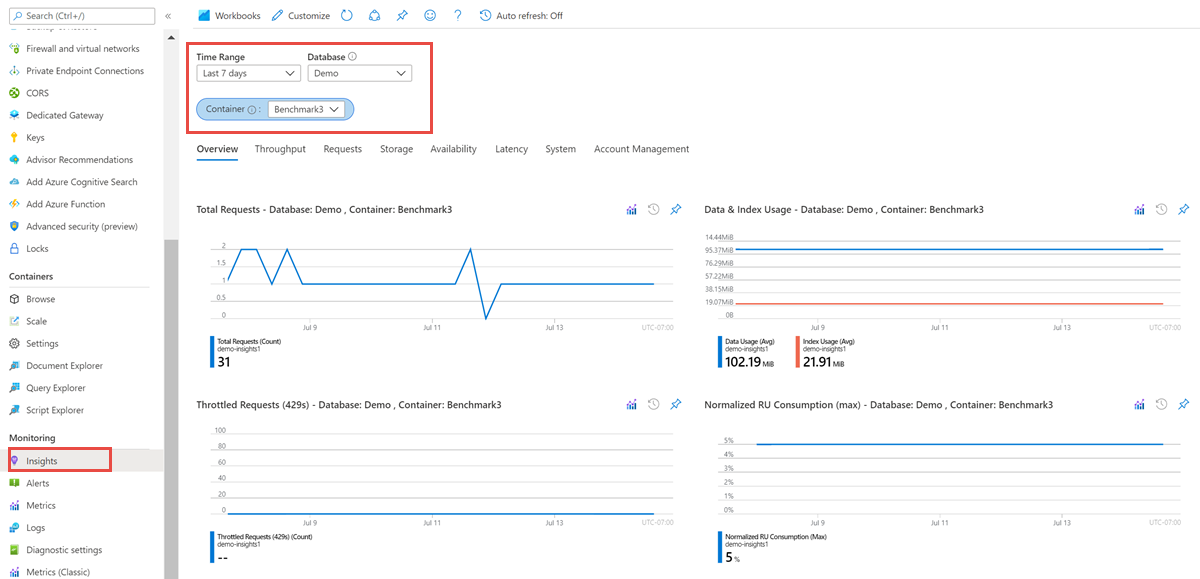 见解:此窗格提供 Azure Cosmos DB 的自定义监视体验。 见解使用 Azure Monitor 中收集的指标和日志,并显示帐户的聚合视图。