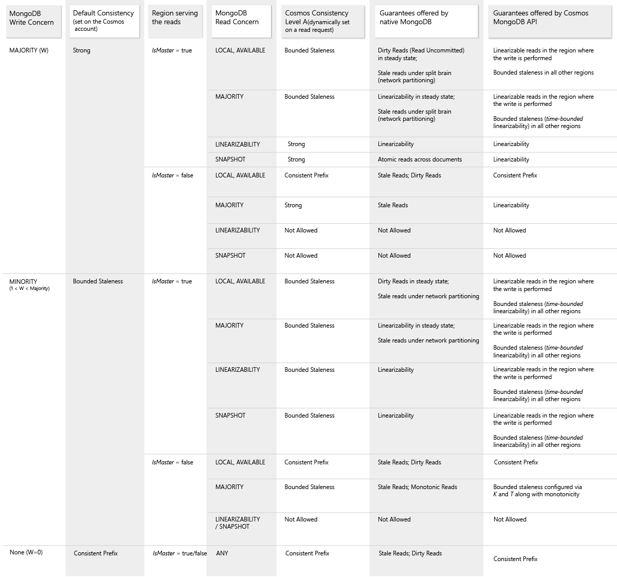 与 Azure Cosmos DB 不同,原生 MongoDB 没有明确定义的一致性保证。 与之相反,本机 MongoDB 允许用户配置下述一致性保证:写入关注、读取关注以及 isMaster 指令 - 目的是将读取操作定向到主副本或辅助副本,以便实现所需的一致性级别。