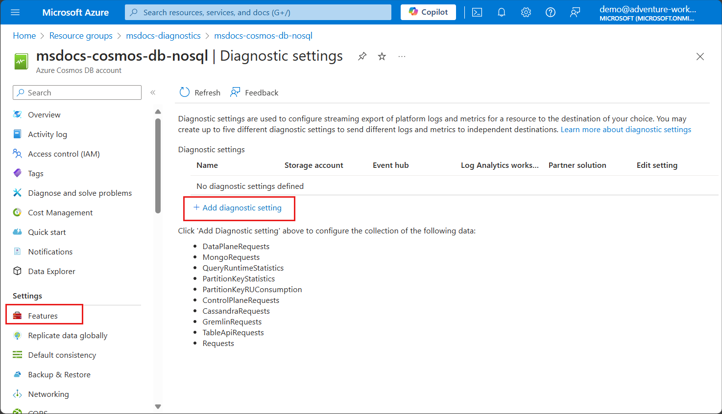 在现有的 Azure Cosmos DB 帐户页上,选择资源菜单“设置”部分中的“功能”选项。 然后,选择“诊断全文查询”功能。