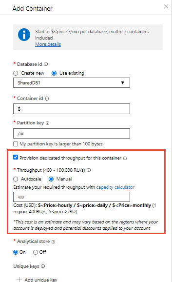 接下来,在该数据库中创建名为 A、B、C、D 和 E 的五个容器。 在创建容器 B 时,请确保启用“为此容器预配专用吞吐量”选项,并在该容器上清晰地配置“P” 个 RU 的预配吞吐量。 只有在创建数据库和容器时,才能配置共享吞吐量和专用吞吐量。