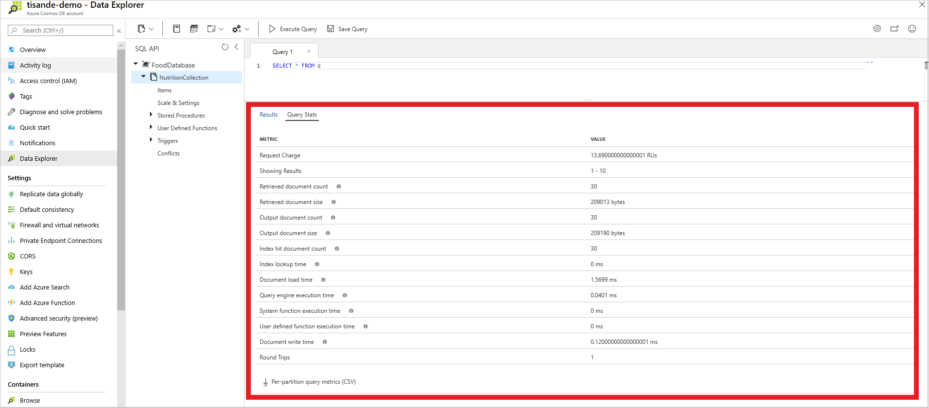 在 Azure Cosmos DB 中优化查询时,第一步始终是获取查询指标。 这些指标也可通过Azure portal获取。 在Data Explorer中运行查询后,Results 选项卡旁边会显示查询指标: