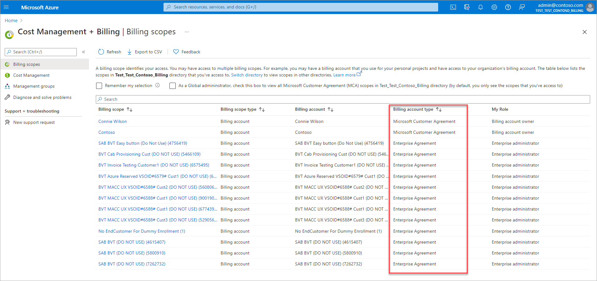 3. 如果您可以访问多个计费范围,请检查计费账户列中的类型。 如果任一范围的计费帐户类型为Microsoft Customer Agreement,则您有权限访问该计费帐户。