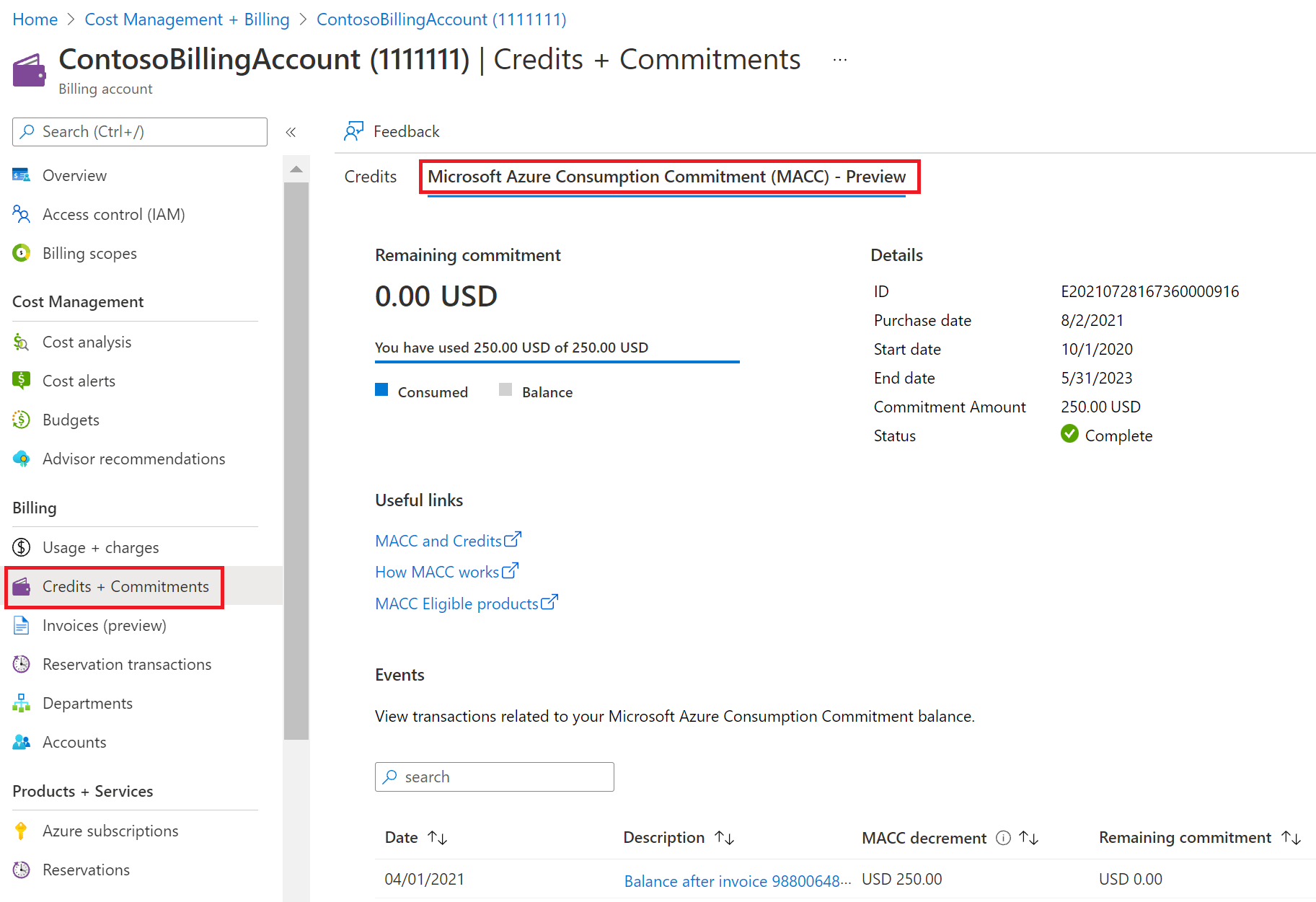 “事件”部分显示对你的 MACC 承诺造成减量的事件(已开具发票的支出)。