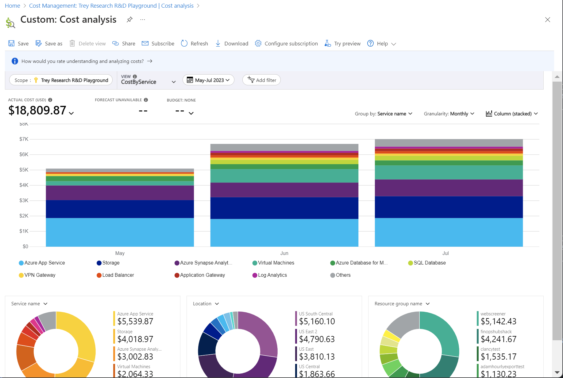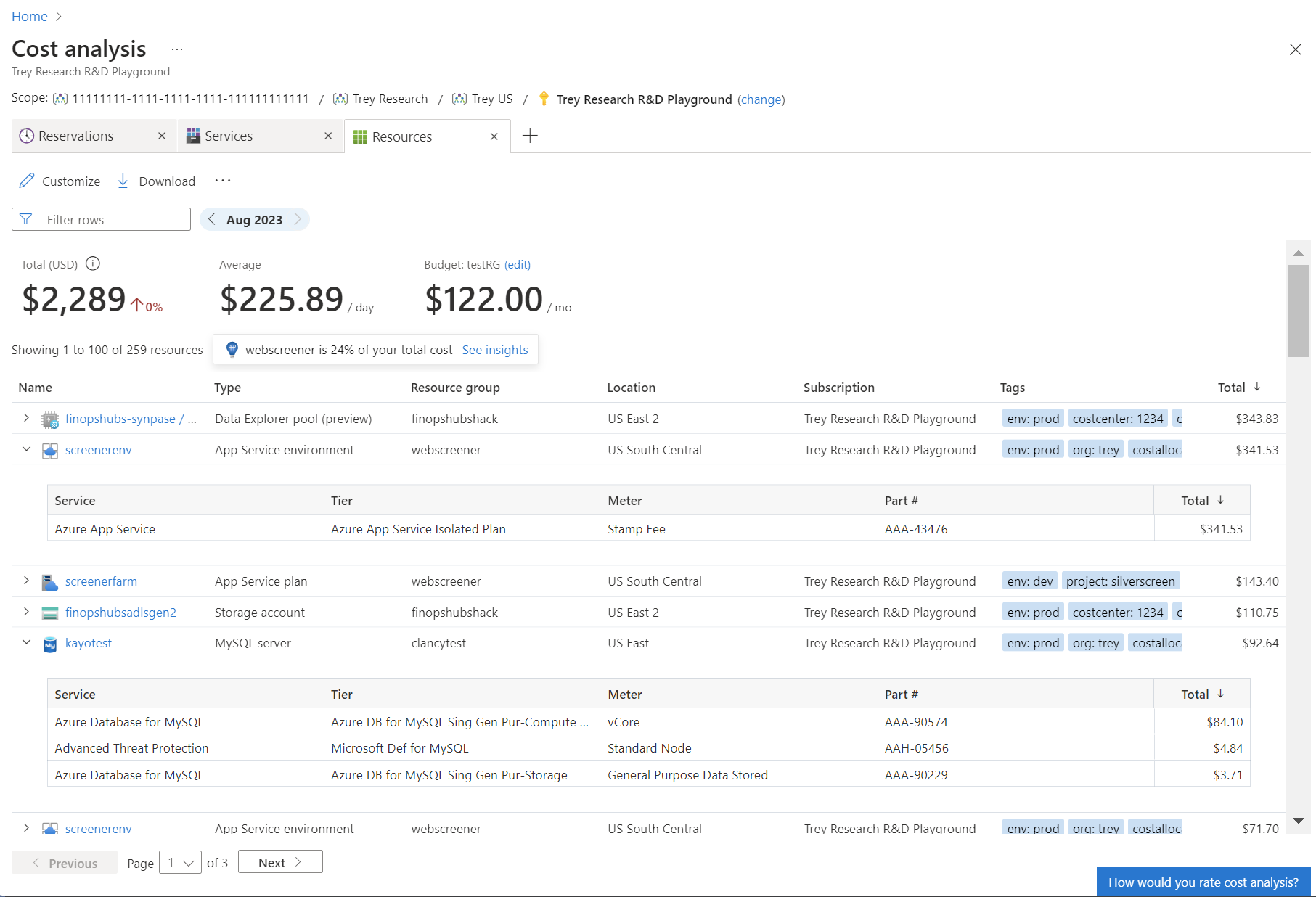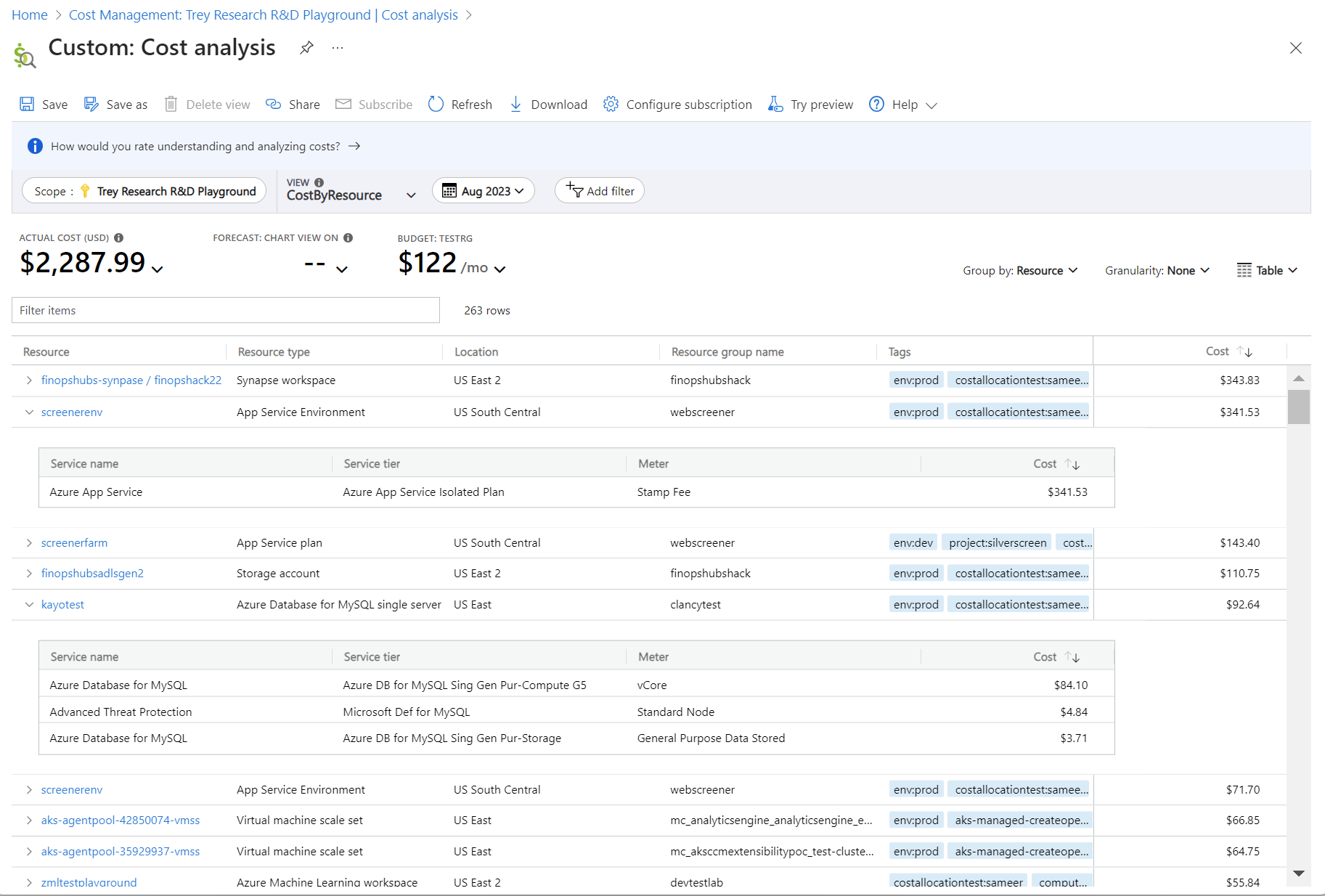 资源组视图在您的订阅、管理组或计费帐户中按资源组汇总成本,并显示嵌套资源。