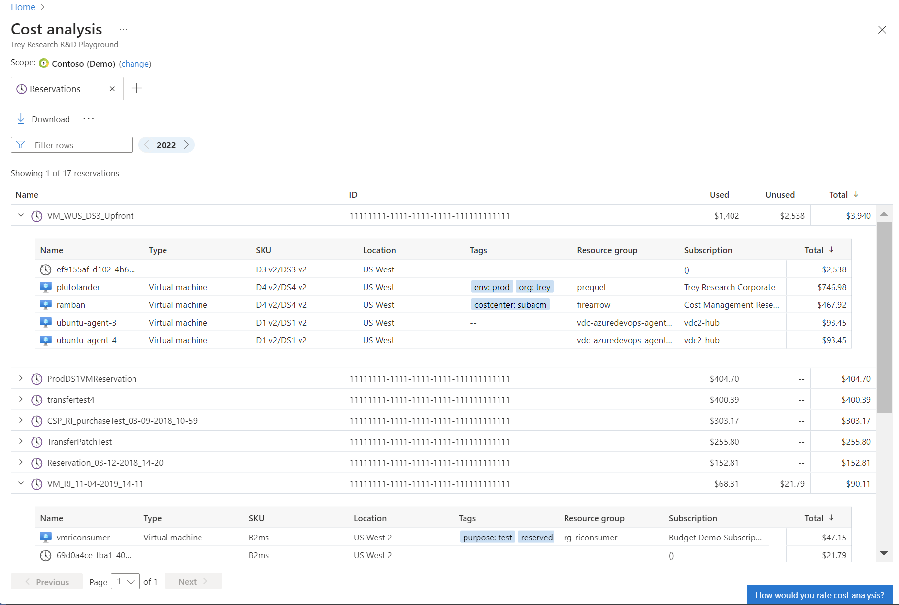 “预留”视图提供摊销预留成本的明细,让你可以查看哪些资源正在消耗每个预留。