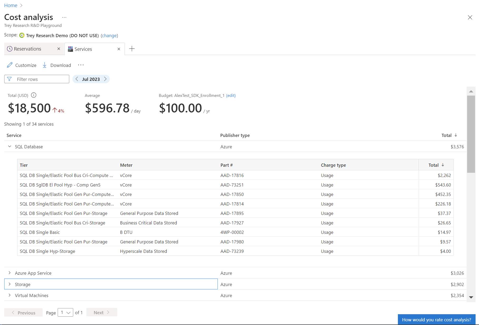 - 将单个资源的 Azure 和市场成本分组在一行中。