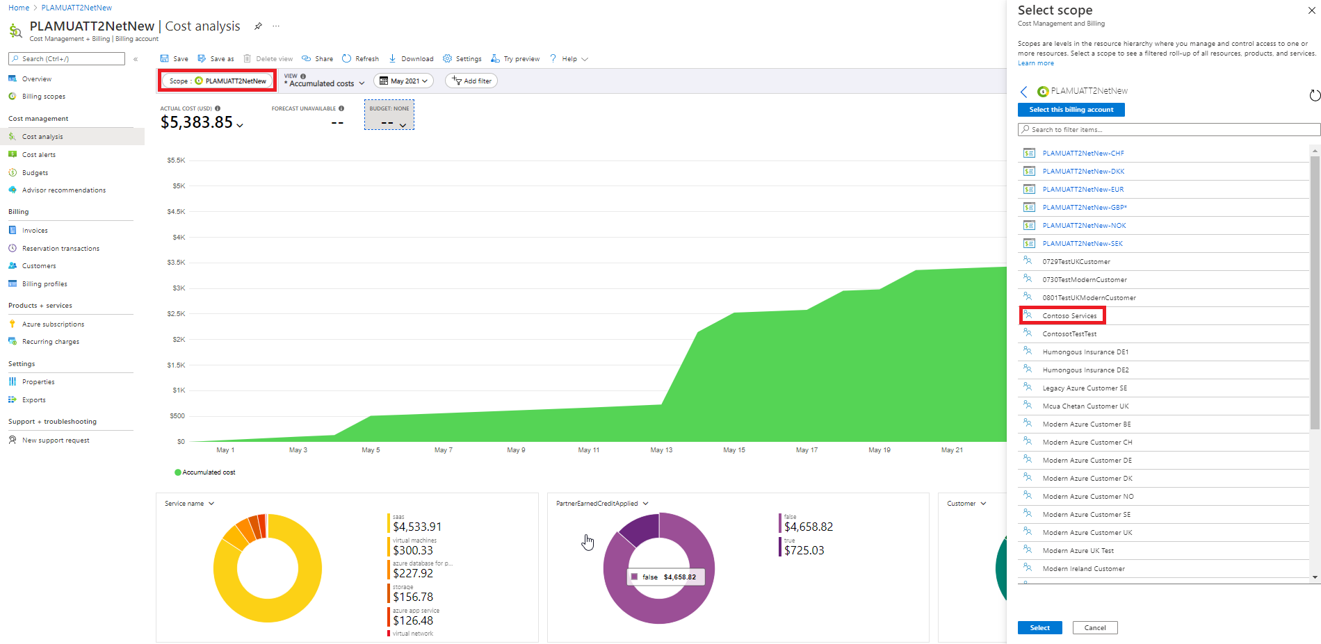 若要查看客户范围内的成本,请在合作伙伴租户中导航到“成本分析”,选择范围选取器,然后在范围列表中选择特定客户。 下面是 Contoso 服务客户的示例。