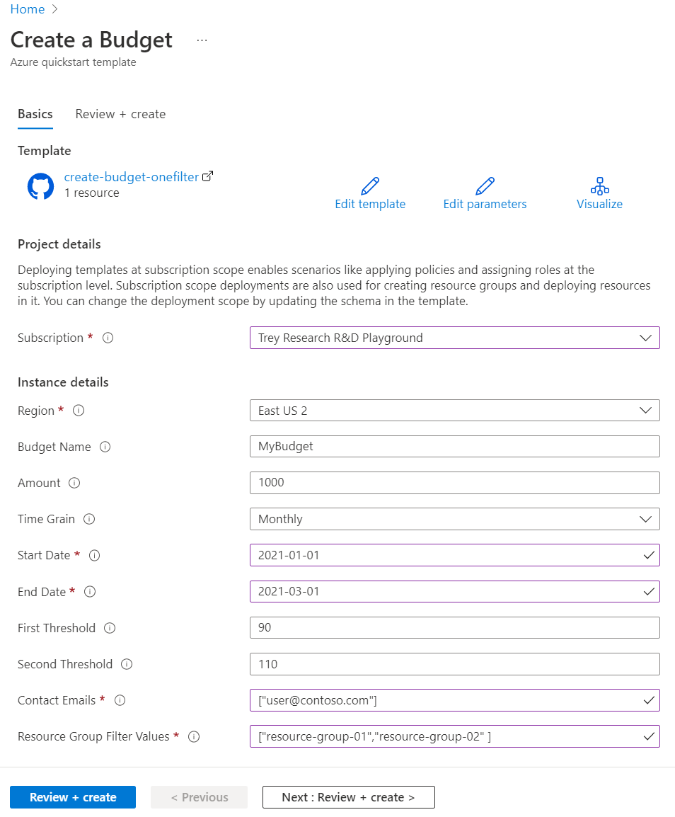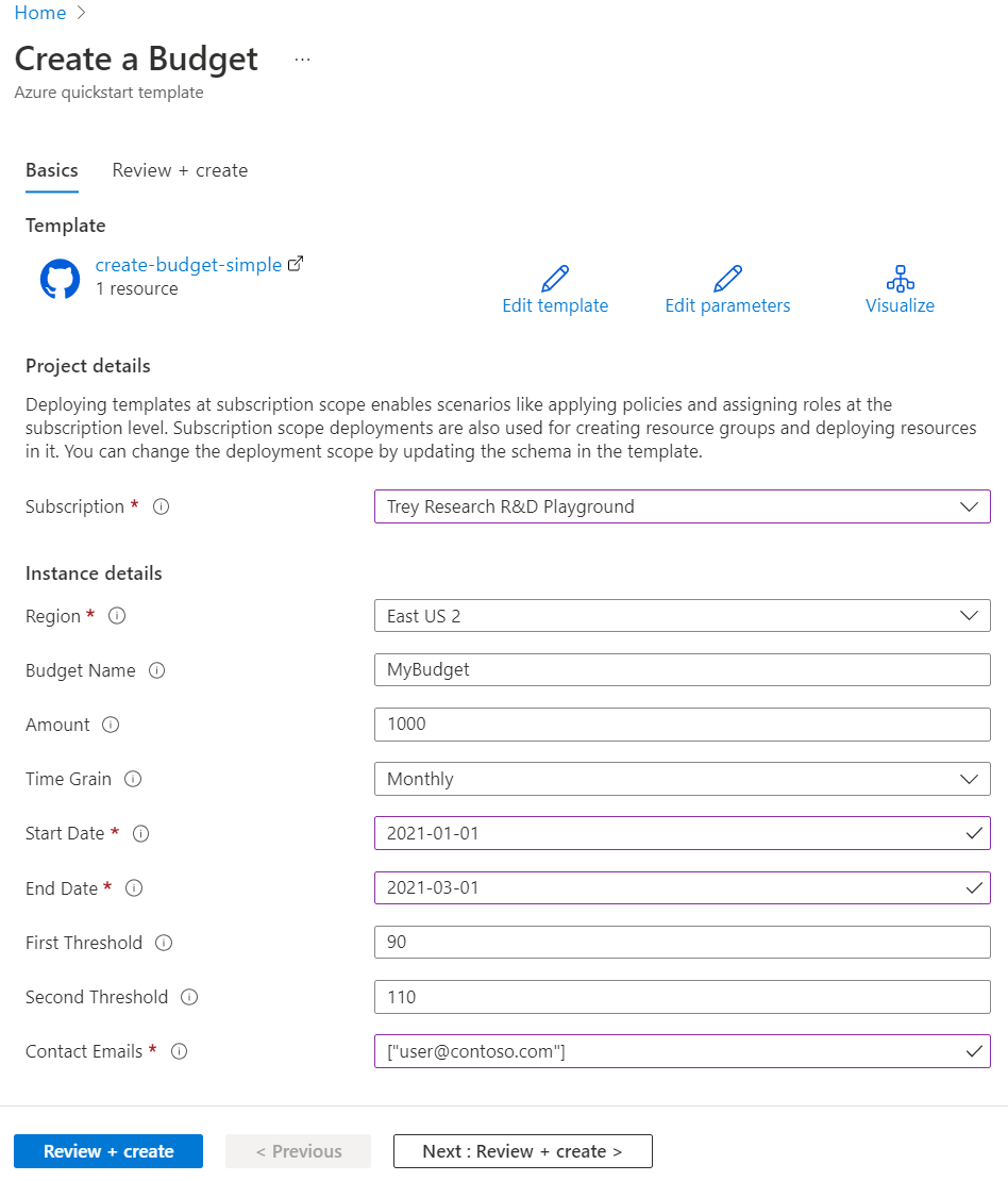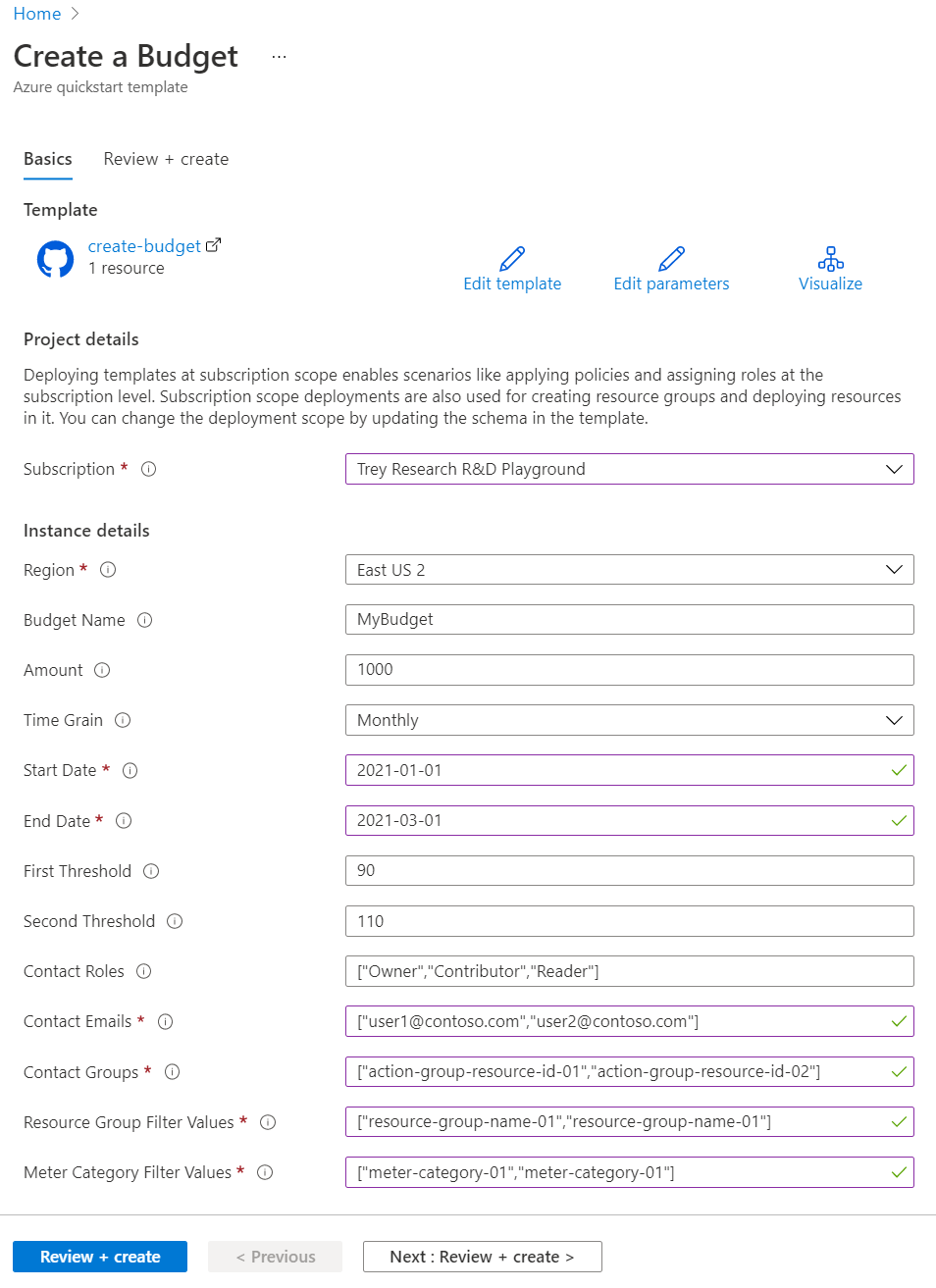 • 联系人电子邮件:输入超出阈值时要将预算通知发送到的电子邮件地址列表。 此字段接受字符串数组。 预期格式为 ["user1@domain.com","user2@domain.com"]