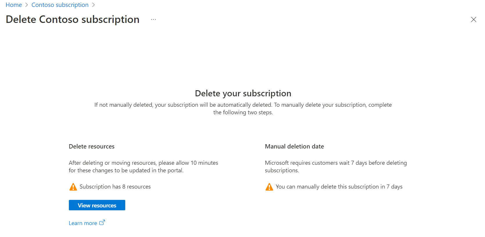 取消最后一个 Azure 订阅后,可以在满足所有必要条件后将其删除。