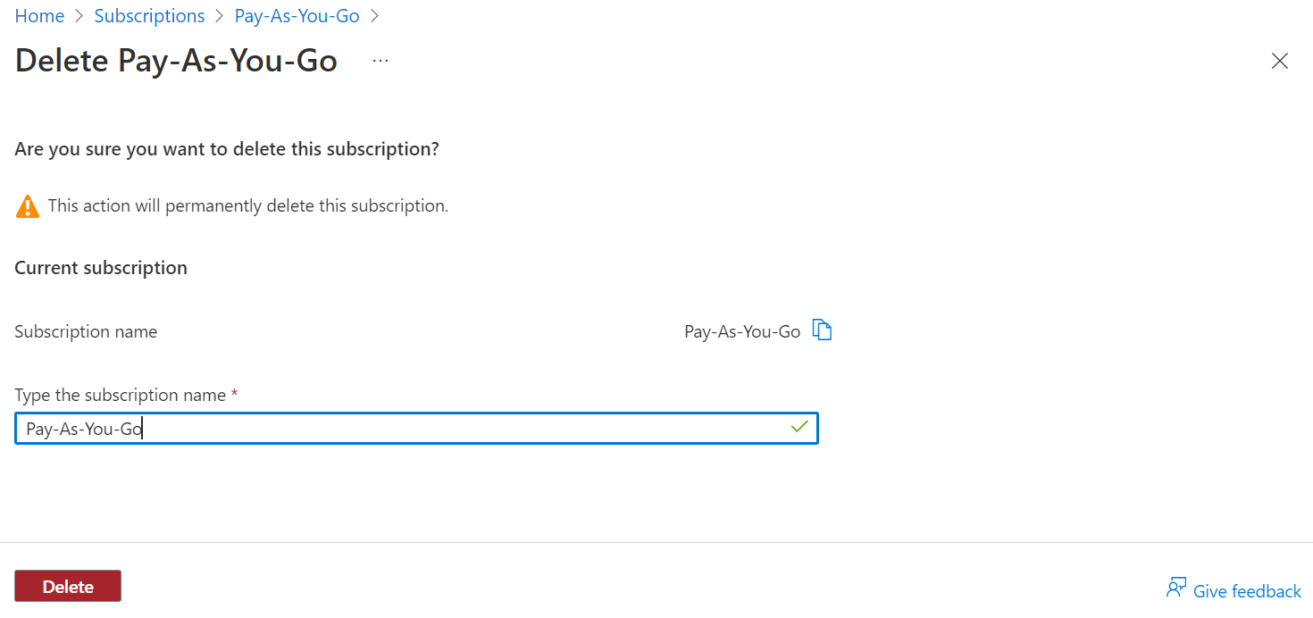 如有必要,请键入订阅的名称,然后选择“删除”。