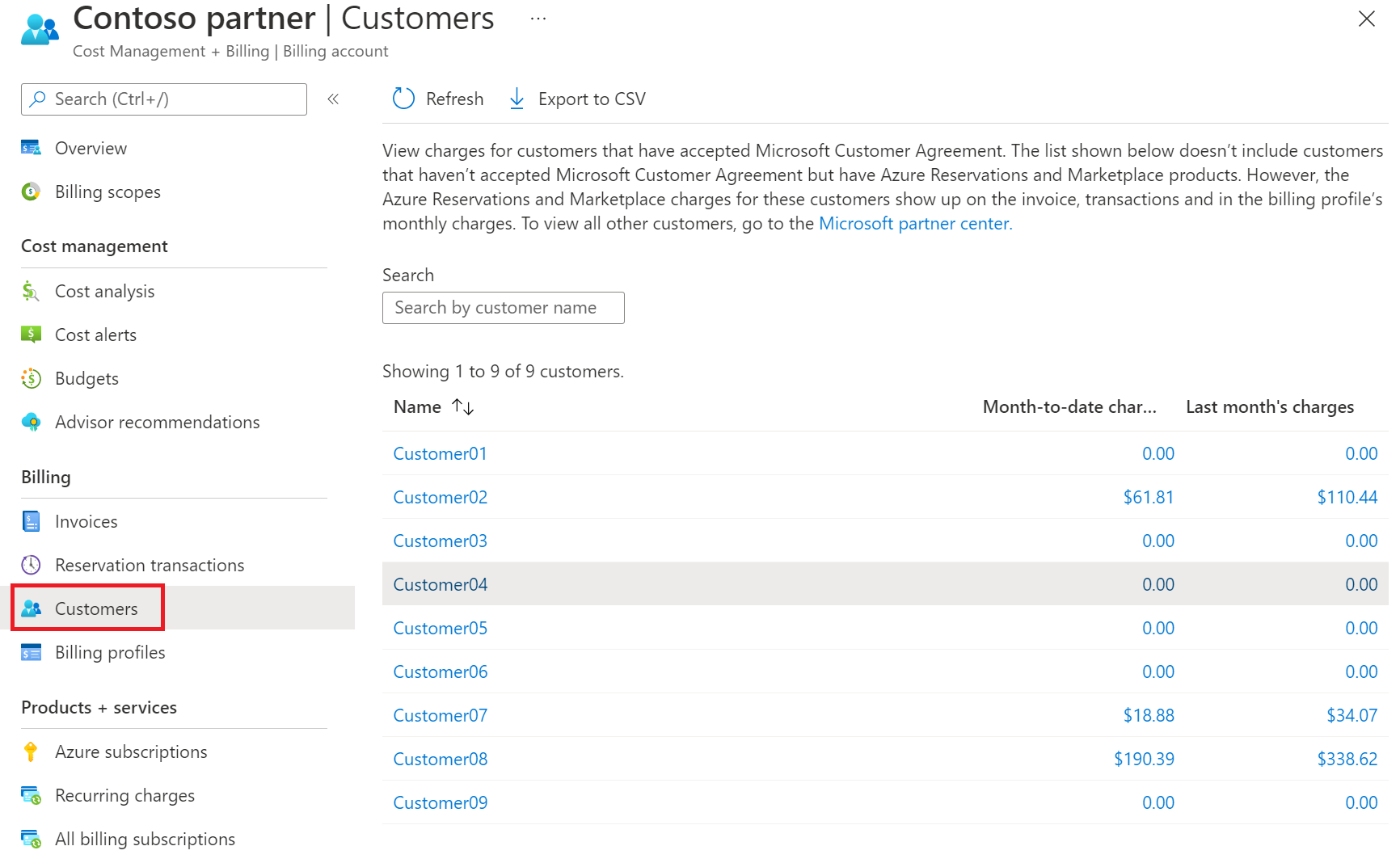 确保你已在合作伙伴中心租户(目录)中,而不是客户的租户。 - 导航到“成本管理 + 计费”。