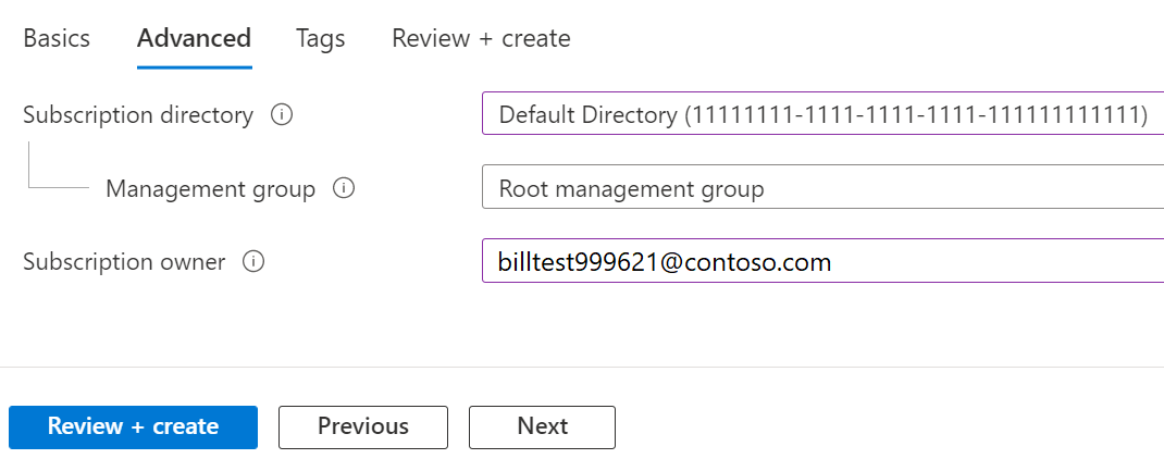 - 选择一个管理组。 这是新订阅与之关联的 Microsoft Entra 管理组。 只能在当前目录中选择管理组。