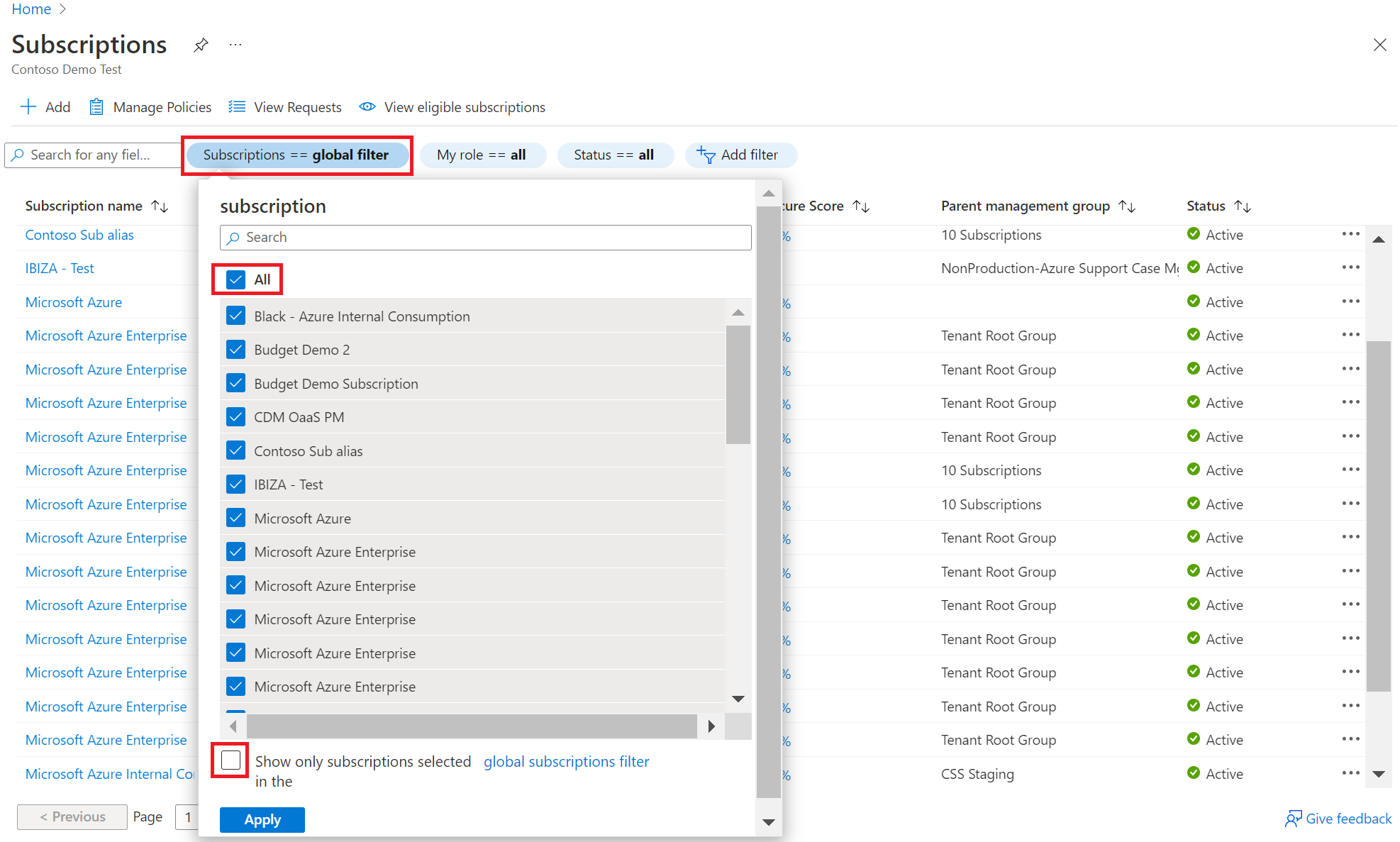 - 在订阅筛选器框的顶部,选择“全部”。 在订阅筛选器框的底部,清除“仅显示在全局筛选器中选择的订阅”。