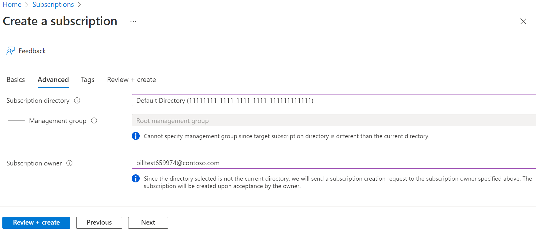 - 选择“高级”选项卡,你可在其中选择更改与新订阅关联的 Microsoft Entra 管理组。 只能选择当前目录中的管理组。