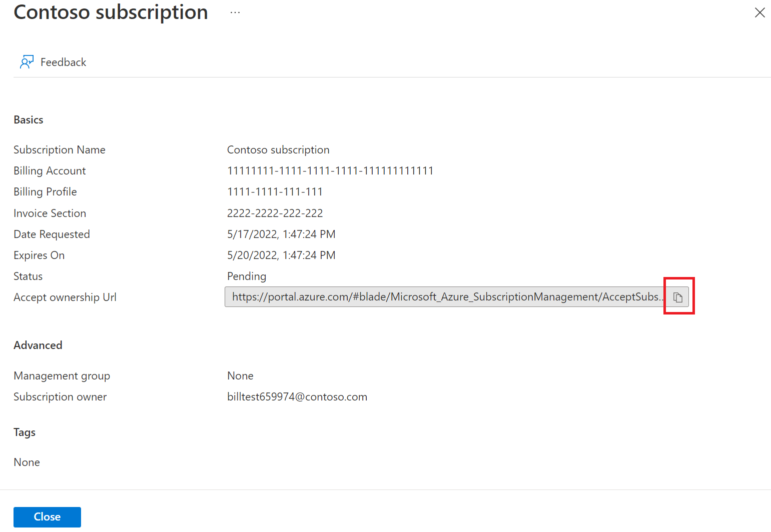 订阅创建者还可以通过“订阅”>“查看请求”来查看订阅请求详细信息。 在此处他们可以打开订阅请求,以查看其详细信息并复制“接受所有权 URL”。 然后他们可以手动将链接发送给订阅接受者。