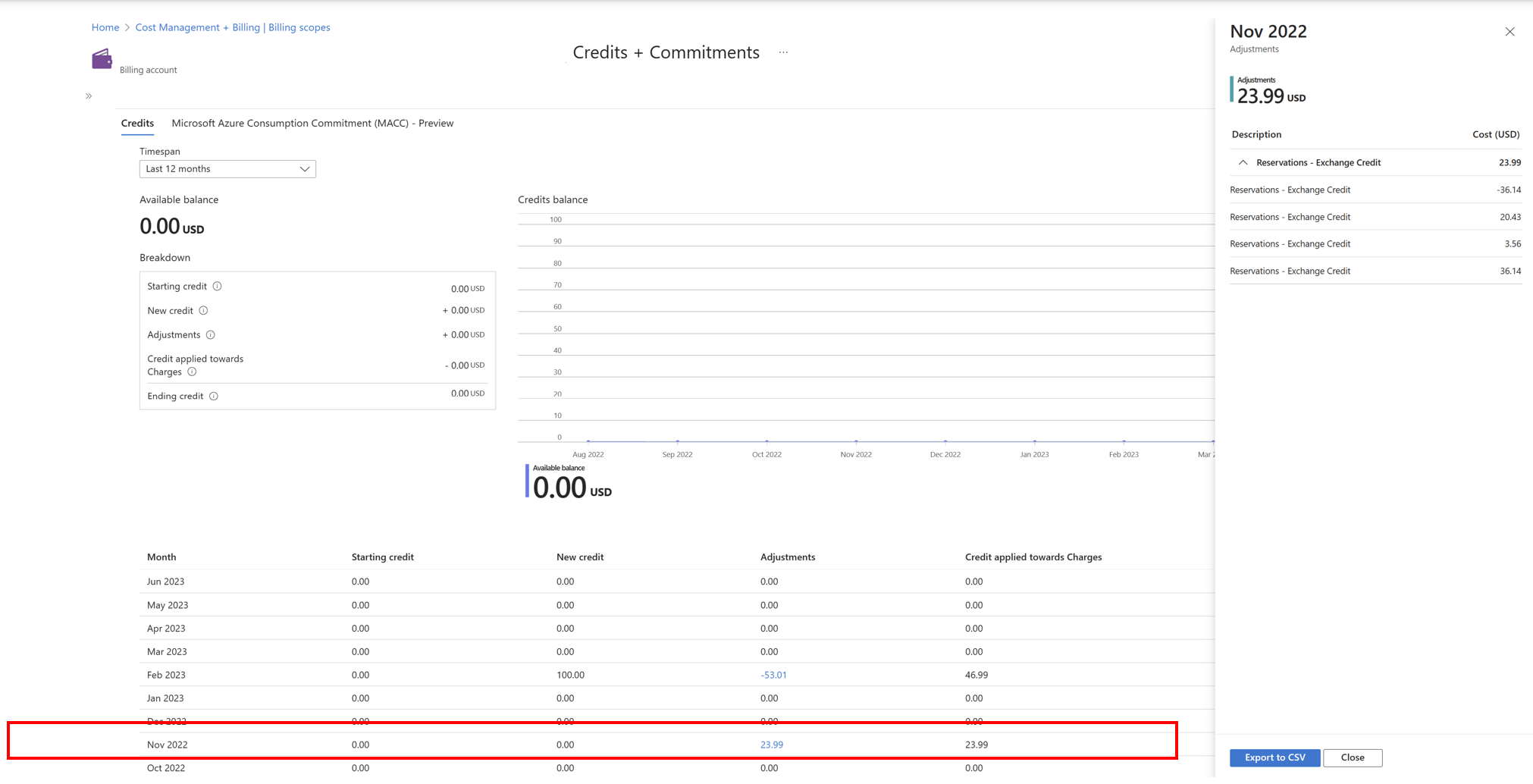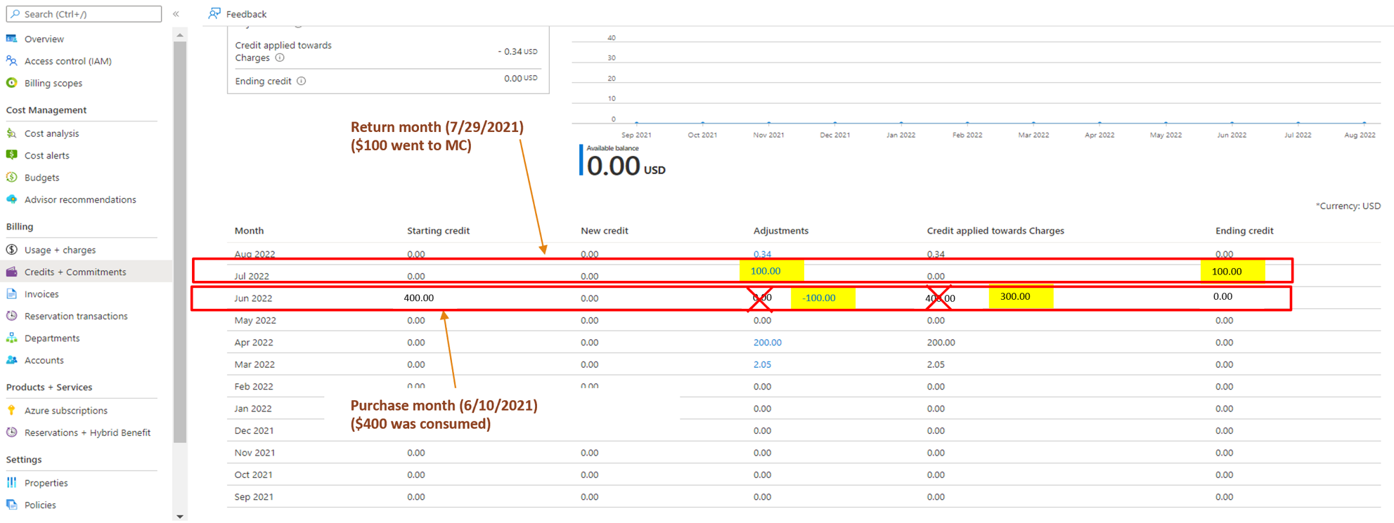 - 完成 2022 年 7 月的预留项退还后,你有权获得价值 100 美元的额度。 你会收到退款金额的贷项凭单。 可在“发票”页上查看此信息。 “使用情况和费用”页面的“退还的超额额度”下会显示相同的额度。 100 美元的调整显示在“额度 + 承诺”页上。 “额度 + 承诺”页上显示调整方面没有变化。