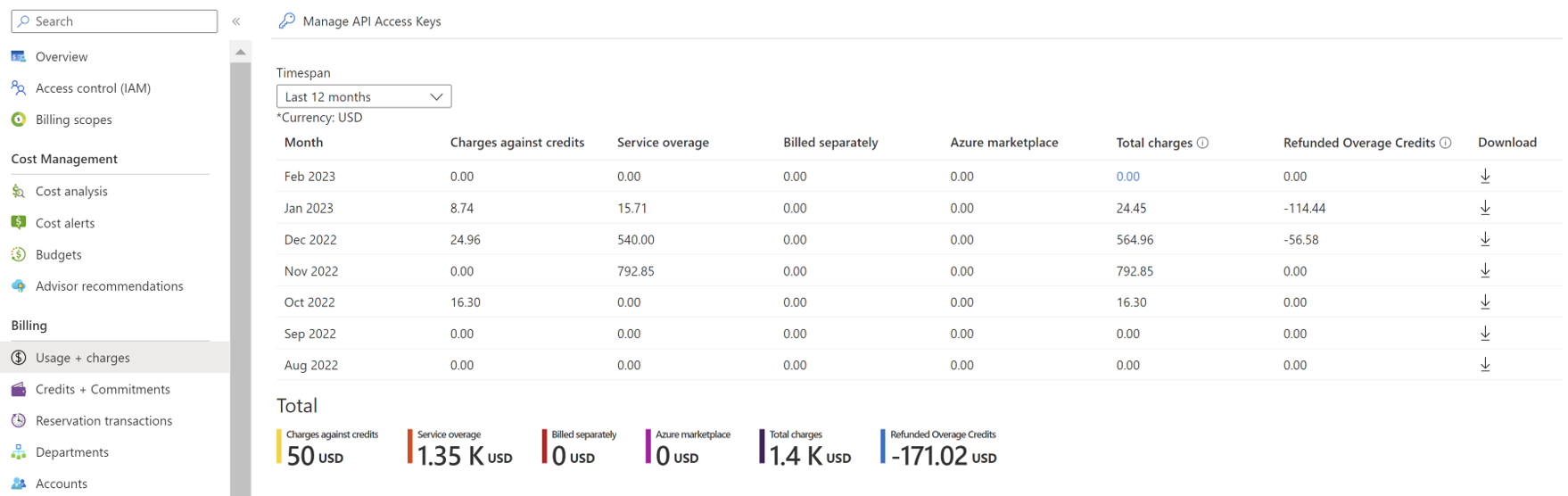 退款使用的付款方式与购买时的相同。 2022 年 7 月,你的货币额度根据相关额度金额进行了调整。 2022 年 8 月,你还收到超额退款部分的额度。 在 Azure 门户中,显示了 2022 年 6 月的额度金额和调整。 退还月份(2022 年 6 月)的调整导致服务超额方面的变化。 可在“使用情况 + 费用”页上查看总费用。 可在“额度 + 承诺”页上查看应用于费用的额度。