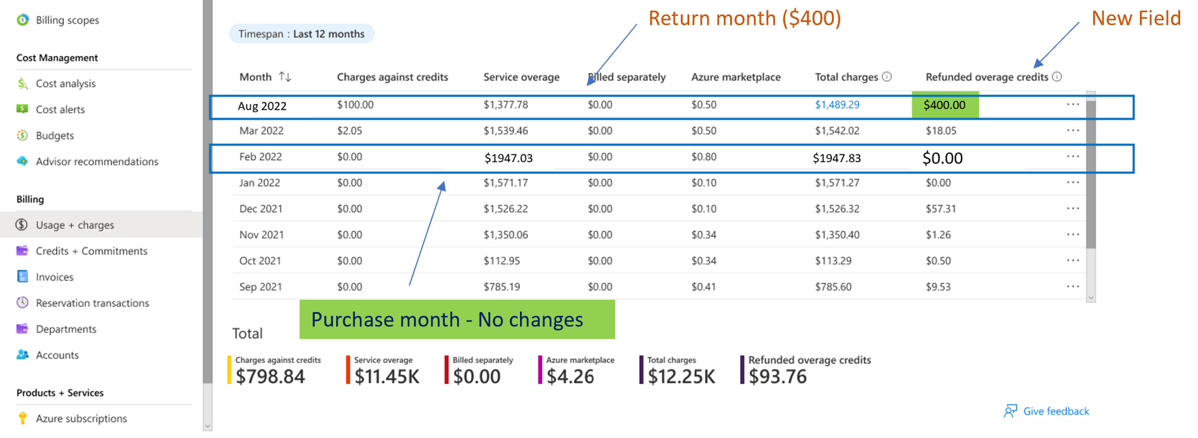 在当前的退款流程中,购买月份超额总计、总费用和应用于费用的额度不会改变(例如,2022 年 6 月)。 为该月份提供的额度显示在“退款超额额度”下。 退款月份的调整显示在“额度 + 承诺”页上。
