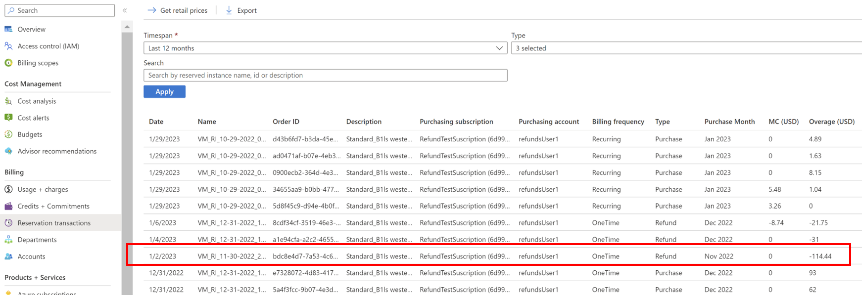 下面是之前的退款流程中的退款示例在 Azure 门户中的显示效果。 下面几点对退款进行了说明。